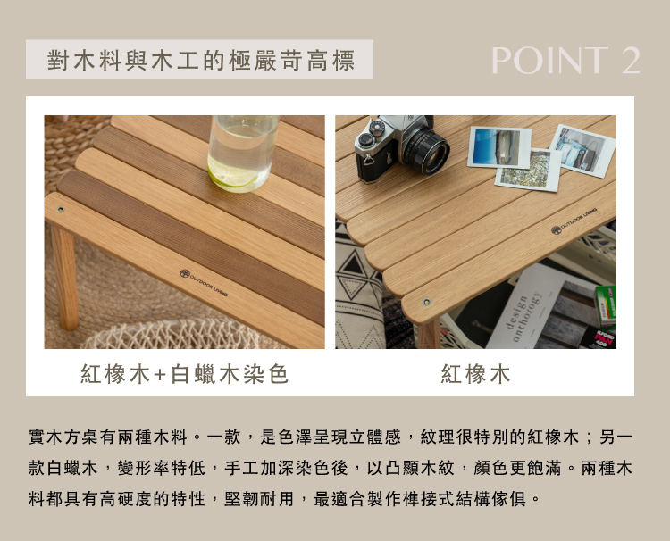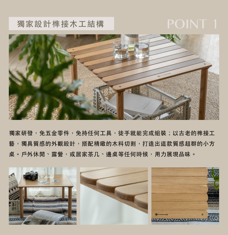 高等級木料與獨家細緻工法,已是Outdoorliving的木質傢俱配件的基本水平;第二波獨家研發,免五金零件,免持任何工具,徒手就可以 優雅完成組裝;以古老的楯接工藝,清新質感的外觀設計,搭配精緻的木料切割,造就一款你從沒看過,質感超群的小方桌。戶外休閒、露營,或居家茶几、邊桌等任何時候,用力展現品味。