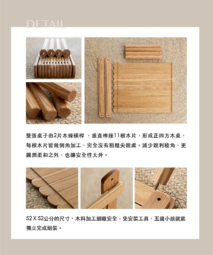 整張桌子由底部2片木片,垂直楯接11根木片,形成正四方木桌,每根木片皆做倒角加工,完全沒有粗糙尖銳處。減少銳利稜角,更圓潤柔和之外,也讓安全性大升。