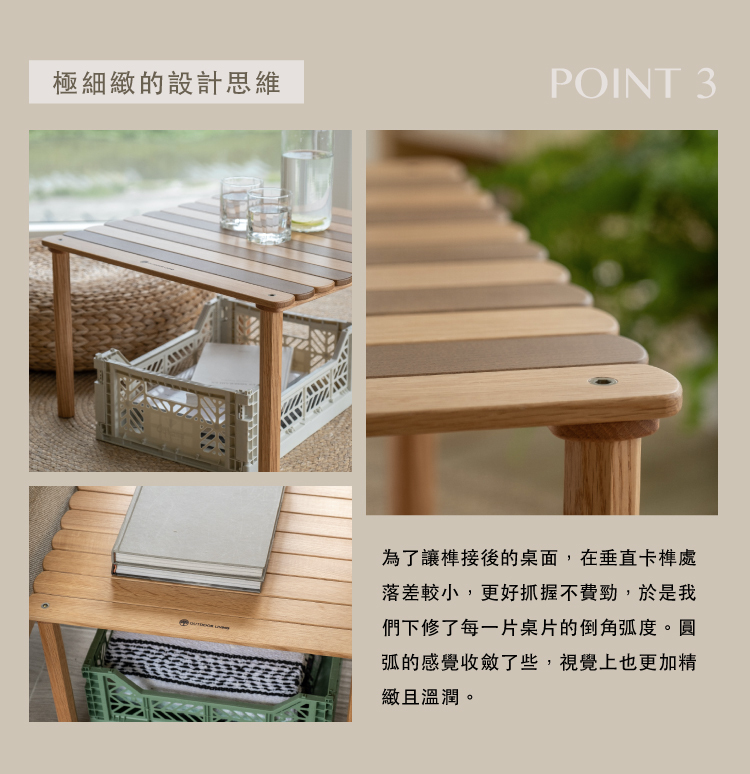 為了讓楯接後的桌面,在垂直卡楯處落差較小,更好抓握不費勁,於是我們下修了每一片桌片的倒角弧度。是的,我們連這個細節都算進去了!圓弧的感覺收斂了些,視覺上也更加中性。