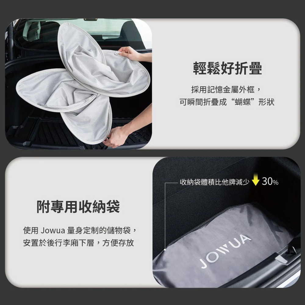 採用記憶金屬外框,可瞬間折疊成“蝴蝶”形狀,附專用收納袋,可收納在後行李廂下層。
