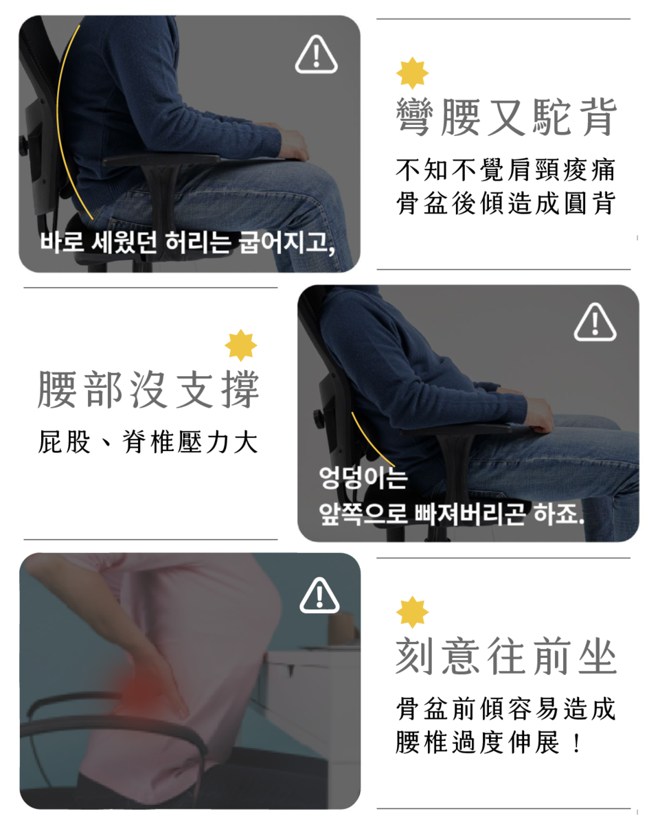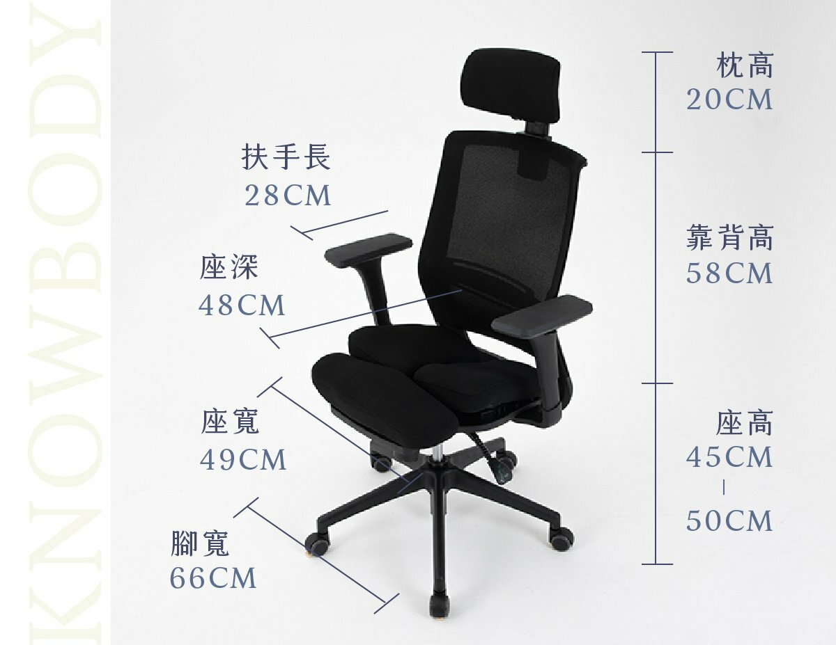 (Knowbodychair是一張適合辦公環境,學生閱讀的時候使用的辦公椅,並不是以向後臥躺為目所開發的椅子,向後躺的功能是為符合更多不同身材構造的人所加入,並不代表它變成一張可以盡情往後仰的椅子。)![]()