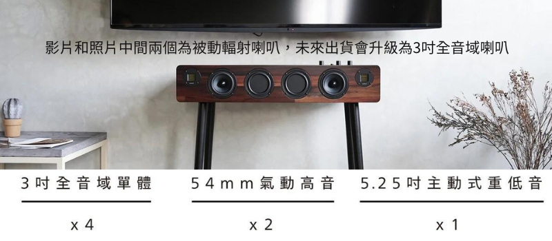 左右聲道和重低音分別為三個獨立音室,內置 9mm木板隔離並加強音箱結構的穩定性,使聲音更清晰不互相干擾。採用兩個54mm氣動高音、四個3吋全音域喇叭,一個5.25吋主動式重低音,以輕巧而具有張力的生動音色傳達出音樂和對話的氣息。