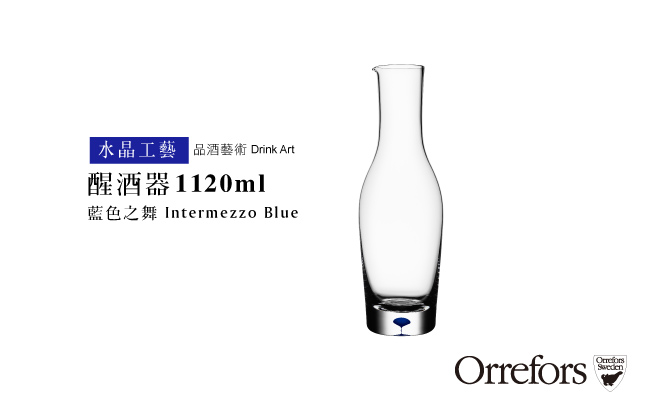 Orrefors 出品的 Intermezzo Carafe 可容納 112 厘升,適合盛裝葡萄酒和水。這款玻璃水瓶由玻璃吹製專家在瑞典人工吹製而成,底部密封有一滴藍色,這是基於傳統工藝的創新。系列於1984年推出,由Erika Lagerbielke設計。