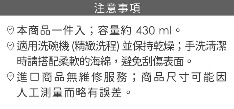 • 每杯容量430ml,重量1.31公斤,高度215cm,直徑84cm