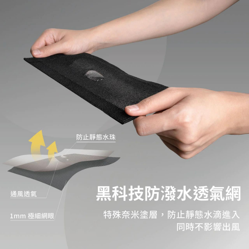 特殊奈米塗層,防止靜態水滴進入,同時不影響出風。